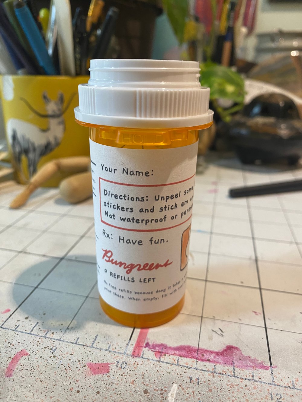 Where do these tiny, odd-sized stickers come from? I recycle the unused portions of mailing labels to make stickers so there is less waste from my store orders. What about the bottles?! In a two person household where both of us are disabled, we take A LOTTA pills. I wanted a way to recycle those, too.