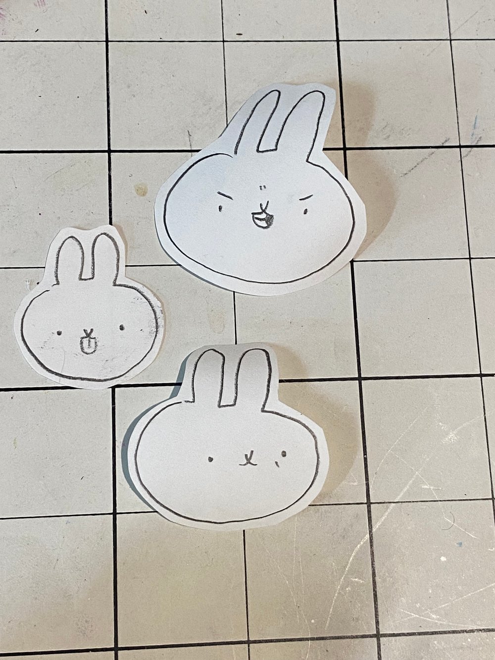This is a mix of hand cut, hand drawn and printed stickers based on the little doodles of Rabbit faces I draw at my desk.