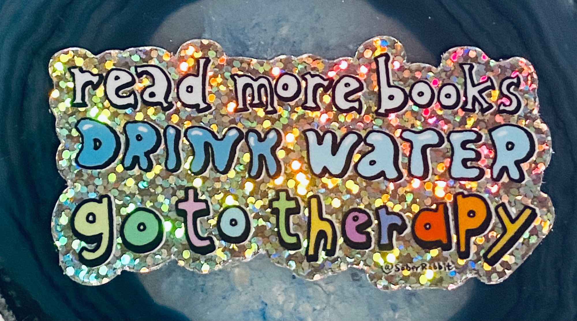 This is my to-do list: read more books, drink water, go to therapy. If you’d like this reminder too, enjoy it on a glittery sticker!