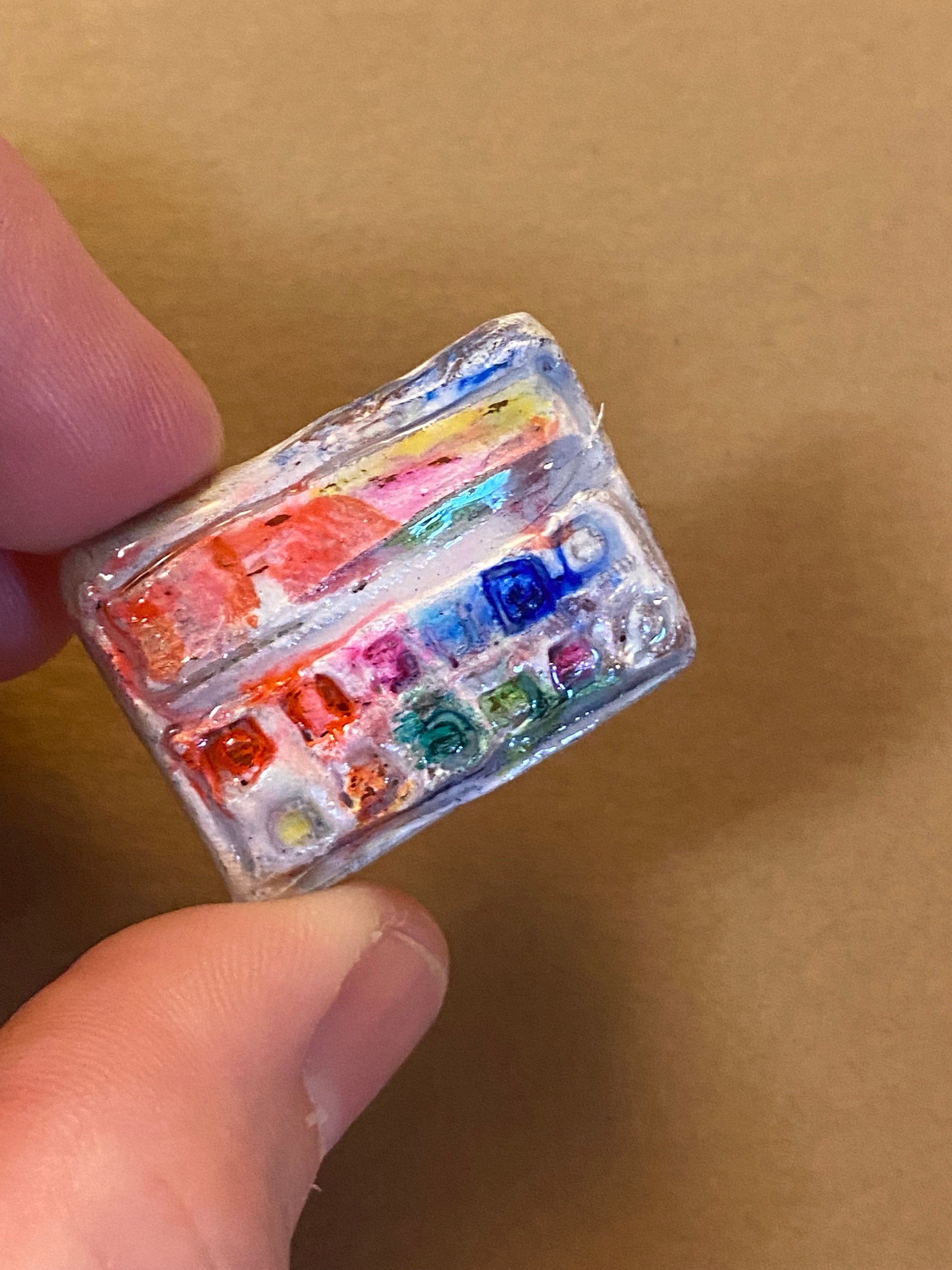 This tiny pin is made of polymer clay, a mix of paint types and sealed with resin.